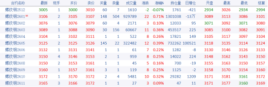 螺纹钢期货12个合约,收盘价较上一交易日均有不同程度上涨,品种总持仓量2564889手,较上一交易日减少29684手,其中,主力合约减少131667手。