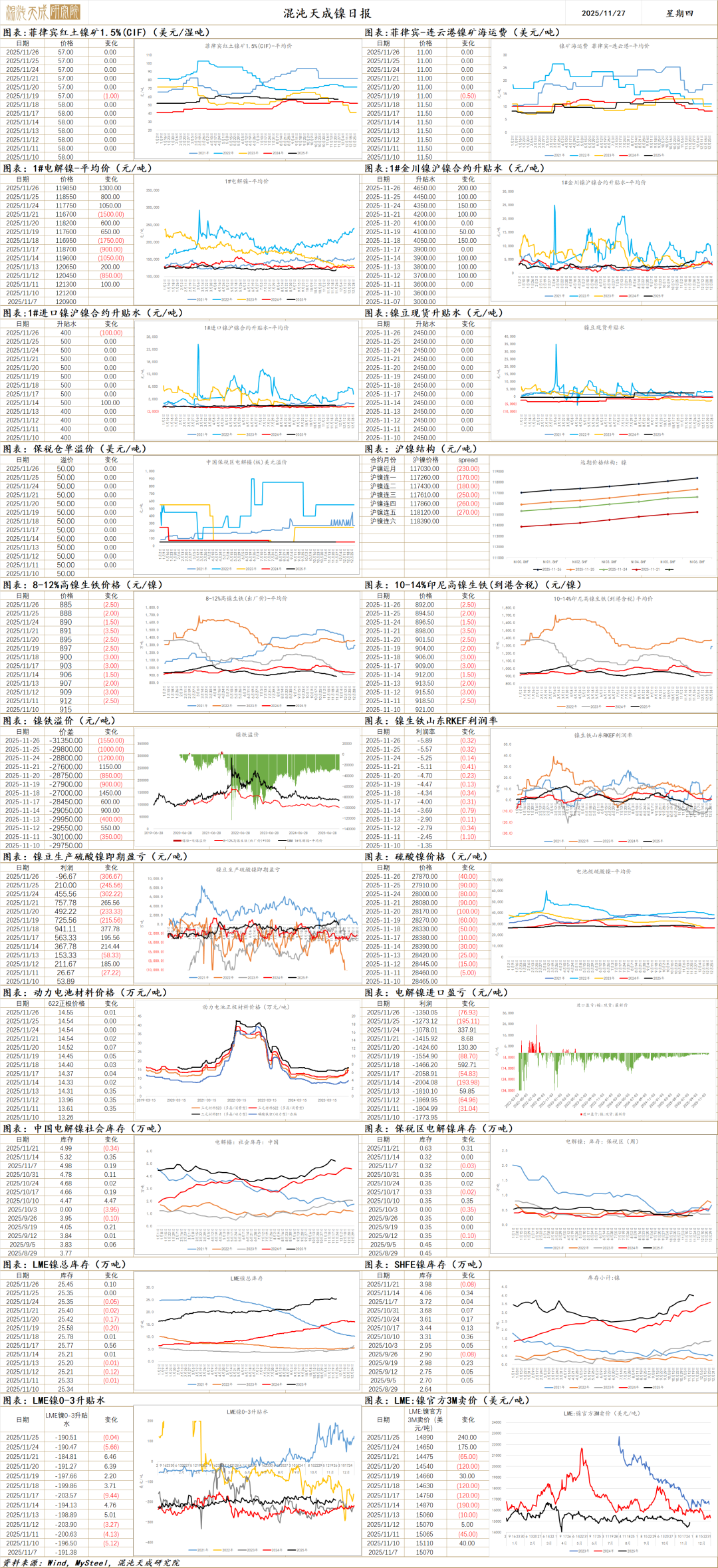 1、【BMI:上调锂价预测,因电动汽车需求强劲】分析师指出,随着有关供应限制措施的实施以及电动汽车等领域强劲需求的支撑,锂价可能迎来上涨,供应过剩局面有望缓解。惠誉解决方案旗下研究机构BMI表示:“我们已上调2025年锂价预测,99.5%纯度碳酸锂均价将达10,100美元/吨,56.5%纯度氢氧化锂均价将为9,700美元/吨。”BMI数据显示,截至11月18日,2025年碳酸锂与氢氧化锂年均价格分别为10,015美元/吨和9,582美元/吨。价格在6月底逼近多年低点后,自7月起呈现过山车式波动。BMI指出:“若供应持续紧张、需求端信号强于预期,加之行业参与者持续看涨,或足以支撑当前涨势,从而对我们的展望构成上行风险。电动汽车电池用锂化学品需求仍居高位,预计将支撑2025年剩余时间的锂价。锂元素在电池化学反应中扮演关键角色,因此在预测期内,随着电动汽车加速普及,锂将成为最大受益者。(文华财经)
