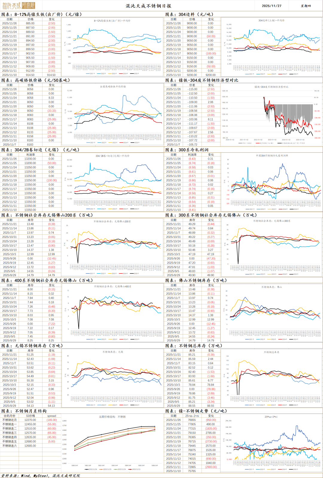 原料端,昨日印尼高镍生铁到港价-2.5至892元/镍点,当前镍铁现货供应充足,价格低位震荡。印尼目前暂停镍铁新建产能批准,短期影响有限。