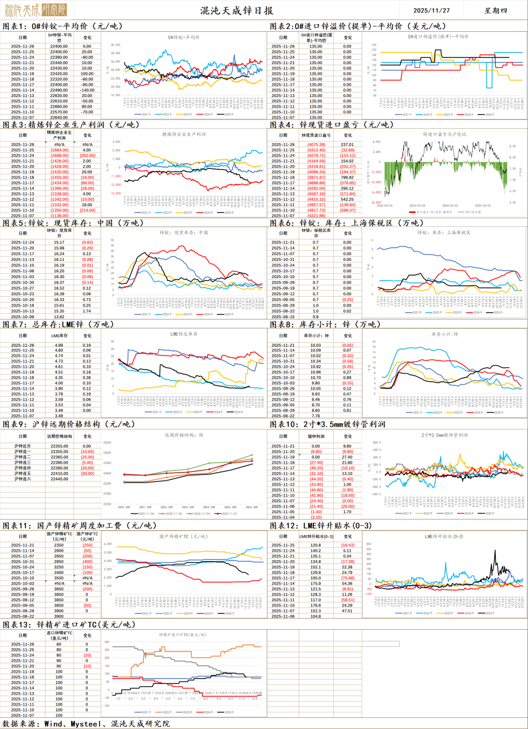 供给端,中国2025年10月锌矿砂及其精矿进口量为34万吨,环比-32%,矿端供应开始趋紧,国产锌精矿TC环比下行,进口锌精矿TC开始下行,冶炼厂锌精矿库存同期中位水平以上,算上副产品硫酸冶炼利润仍存,从百川11月排产调研来看,11月排产仍有7800吨的预增,但据钢联调研12月冶炼厂减产增多。