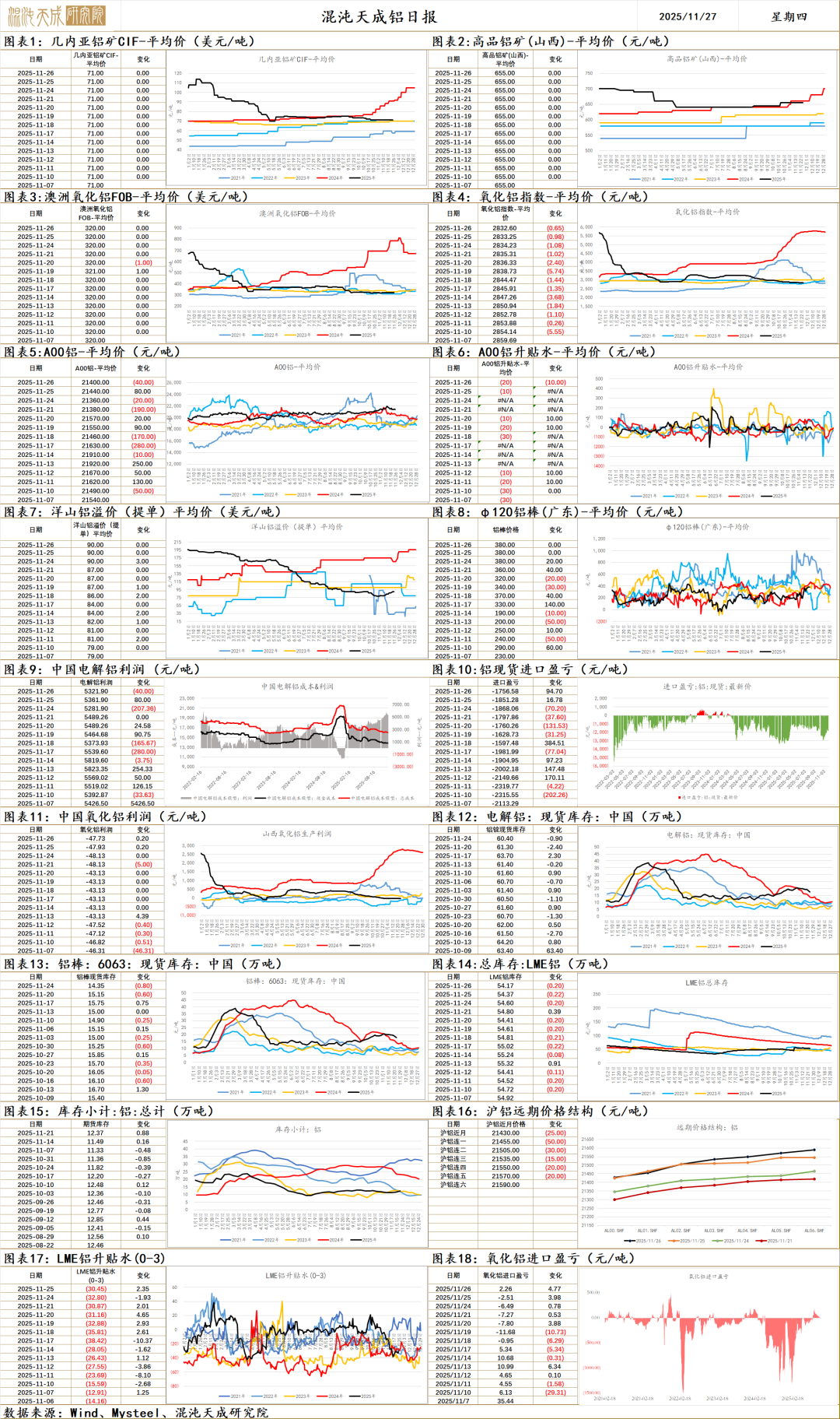 2.【天山铝业:140万吨电解铝绿色低碳能效提升项目首批电解槽通电投产】SHMET11月26日讯,天山铝业(002532.SZ)公告称,公司140万吨电解铝绿色低碳能效提升改造项目首批电解槽正式开始通电启槽。项目完工后,公司电解铝产量将提升至合规批复产能140万吨/年,铝液综合交流电耗将达到行业领先水平。项目后续将依托外部绿色电力作为能源保障,完全建成后公司绿电占比将进一步提升,强化电力成本竞争优势并加速电解铝主业绿色化转型。