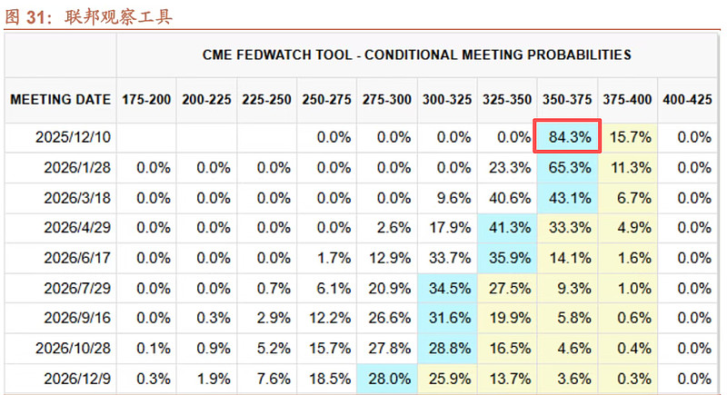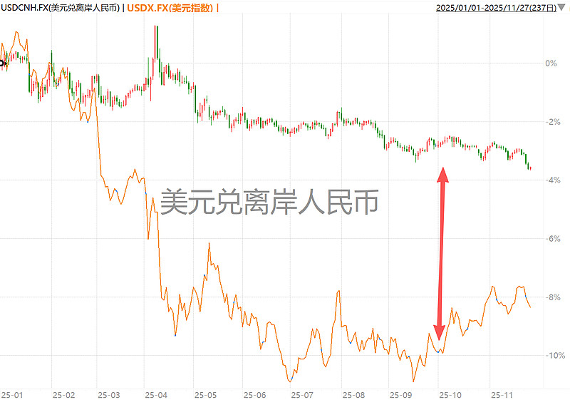 近期美联储官员密集放鸽,美联储12月降息的预期再度升温(最新升至80%以上),美元指数自100附近回落至99,进一步强化了人民币的升值趋势。