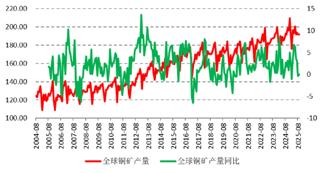2025年,铜矿供应增量不及预期。国际铜研究组(ICSG)发布的数据显示,2025年8-9月全球铜矿同比出现负增长。根据矿企财报和产量指引推测,2025年全球铜矿产量小幅下降0.12%。其中2025年三季度,前二十大铜矿量同比下降6.5%,多数企业受外部扰动和内部因素影响出现减产,仅部分企业凭借矿区运营优化实现增长,行业分化态势显著。