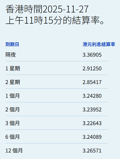 11月27日,港元拆息再度抽升,而与楼按相关的一个月拆息连升六日,报3.2428%,升26.512基点;反映银行资金成本的三个月拆息报3.22643%,升2.643基点。