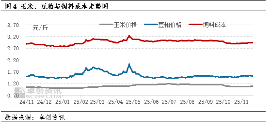 饲料原料价格涨势不强。玉米方面,东北产区基层售粮意愿偏低,市场有效供应量增速放缓,市场价格或整体偏强,但12月中下旬基层或短时增量,价格或阶段性回调。豆粕方面,近期东北大豆市场运行平稳,在国储收购价发布后,市场情绪有所降温,预计短期价格偏稳运行。而随着中国大量采购美豆落地,后期供应预期宽松,低蛋白价格有望承压下行。整体而言,12月份饲料原料价格上涨动力不强,后期或稍显弱势,因此预计12月份饲料成本增幅不大。