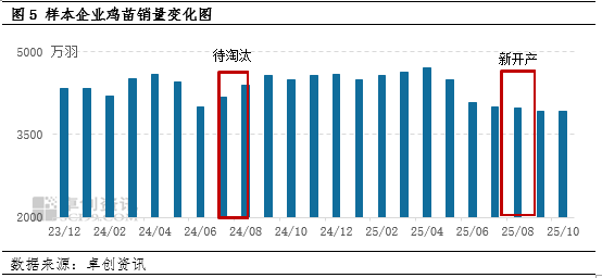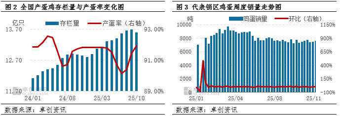 根据前期鸡苗销量估算,12月份进入产蛋期的蛋鸡应为8月补栏的鸡苗,此阶段鸡苗销量环比减少0.43%,而12月出栏的老母鸡是2024年7-8月份补栏的鸡苗,此时间段鸡苗销量环比增多,因此,12月份待出栏老母鸡环比增加,出栏老鸡多于新开产蛋鸡的现象仍将继续,产蛋鸡存栏量或延续减少趋势,鸡蛋产量或减少,供应压力缓解。需求方面,12月份多数时间仍处消费淡季,少数时间或有商超、电商平台的促销活动,且2026年春节时间靠后,春节需求对12月鸡蛋消费的拉动作用不明显,因此预计12月份鸡蛋需求或长期暂处低位,月底或微幅增多。综上所述,12月份全国鸡蛋供应量或高位减少,供应压力略有缓解,需求或长期维持低位,月底短暂增加,鸡蛋价格或在中上旬维持低位,月底有小幅上涨可能,月内价格或在2.80-3.10元/斤的范围内调整。