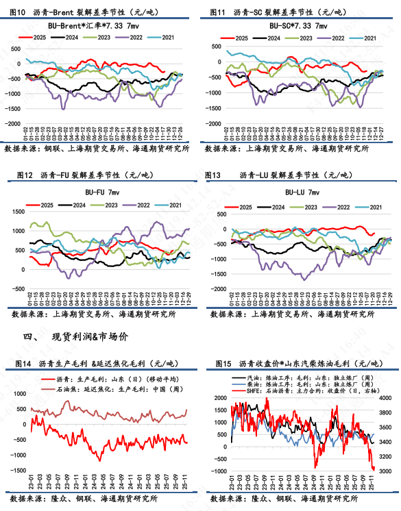 【3】裂解变化:①BU-Brent录得-162元/吨,7天累计+29元/吨。由于沥青基本面过于弱势,油价横盘震荡,使得裂解差与油价走势不趋同(见图9)。目前来看,BU跌势有所放缓,裂解差往下下探空间或收窄。当日BU主力涨幅1.7%;Brent跌幅0.1%(以下午3点收盘成交价计算)。②当日BU-SC(+47)/BU-LU(+88)/BU-FU(+41),裂解差均回升。