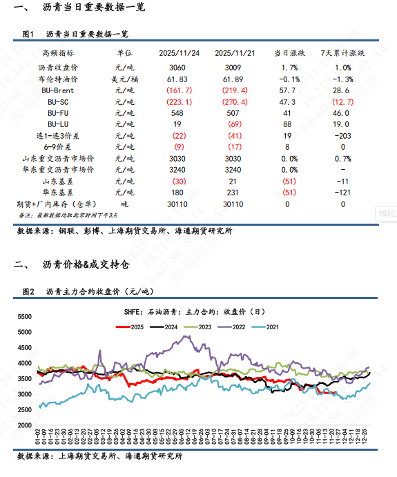 【1】盘面表现:BU主力2601日内持续拉升,最终收盘于3060,振幅2.34%,涨幅1.69%,近7天累计+1.0%。次月合约2602涨幅1.26%,合约期限仍呈现近低远高的Contango结构。各合约相对上周五价格均上升。