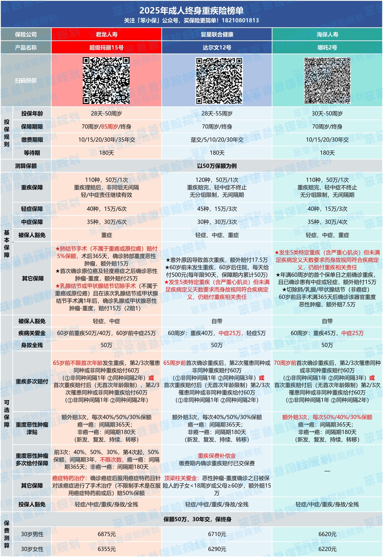 三款产品都有定期和终身版二种选择,可以赔付同种和不同种重疾,但也有差距!