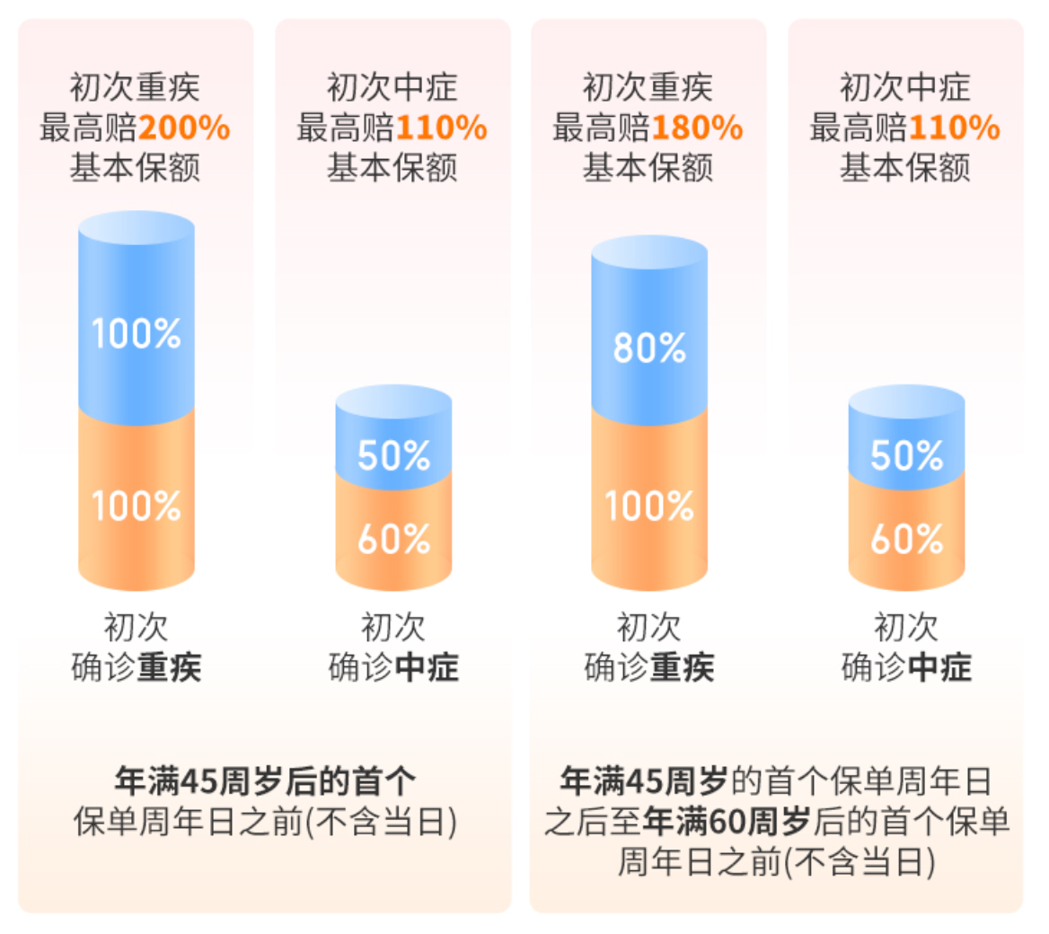 60岁前确诊重疾多赔80%、中症多赔50%,还额外覆盖轻症(多赔10%)