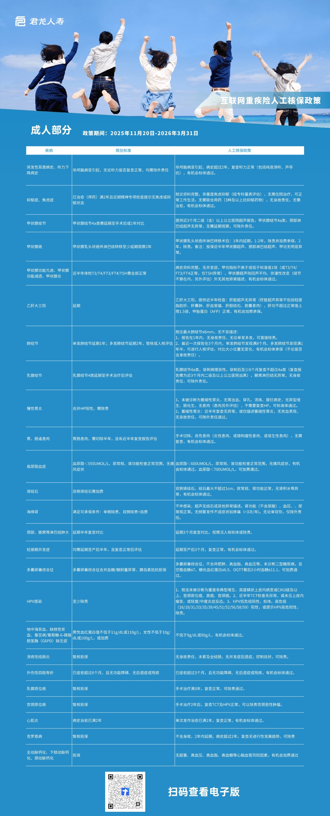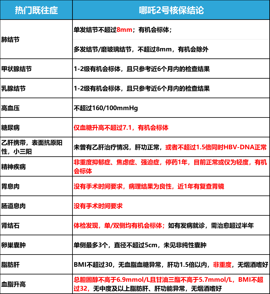 这次哪吒2号又做了进一步放宽,对亚健康人群极其友好:8mm以下肺结节有机会标体承保;4a级甲状腺/乳腺结节有机会承保;甲状腺癌/乳腺原位癌术后有阶段性人工核保放宽政策;小三阳肝功异常有机会标体,大三阳也有人工核保放宽机会;轻度抑郁症、焦虑症、强迫症有机会标体承保;