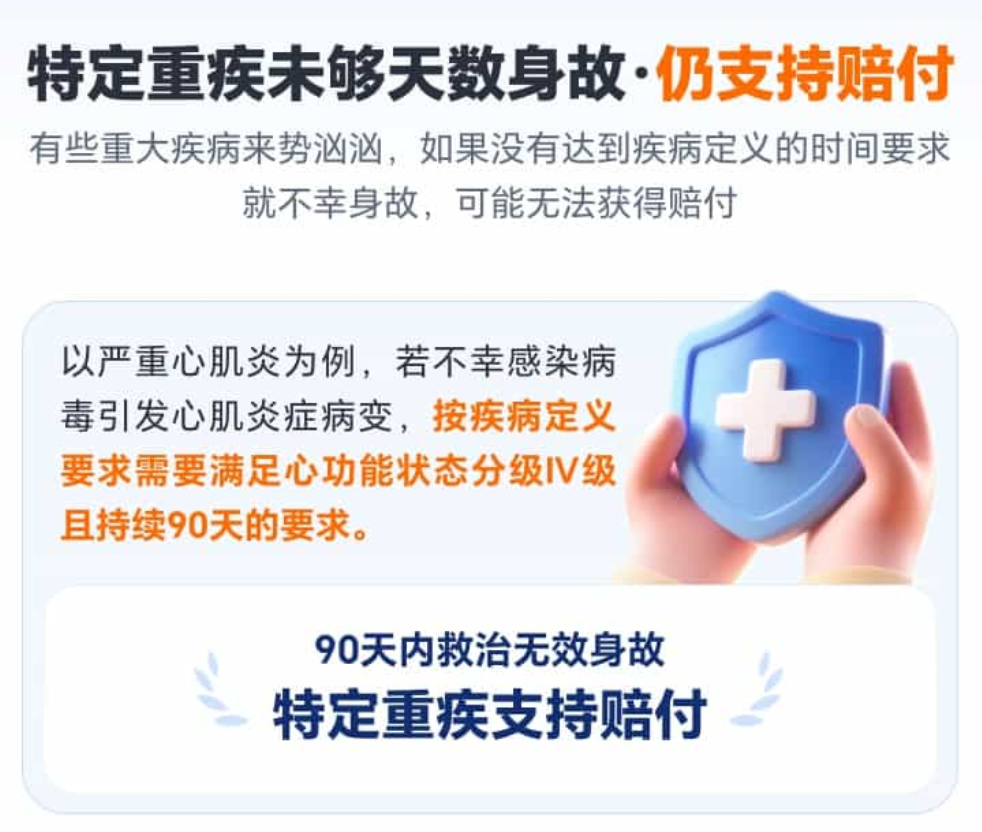 达尔文12号和哪吒2号重疾保障理赔门槛低:针对特定重疾(比如严重心肌炎、严重肺源性心脏病),就算没满足疾病定义要求的天数就身故,也能按重疾赔付。