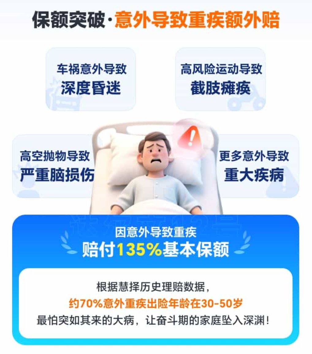 同时达尔文12号的重疾保障还有个额外赔付,因意外导致的首次重疾,能额外赔35%保额:比如买50万保额,意外重疾能拿67.5万,对男性或户外、高空等职业人群更实用;