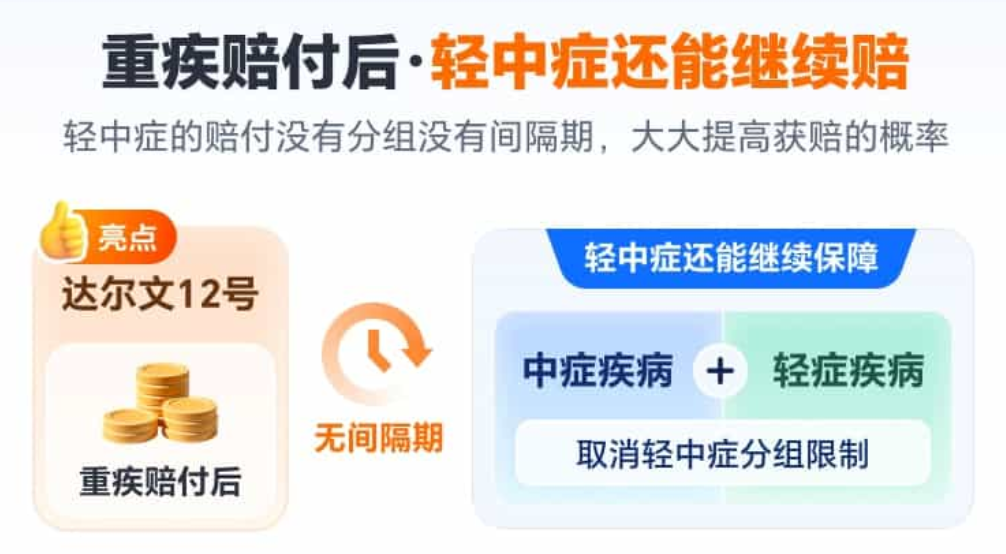 达尔文12号重疾险的中轻症完全取消分组限制,不管是30种中症(每次60%保额)还是45种轻症(每次30%保额),赔过一次后不影响其他病种;