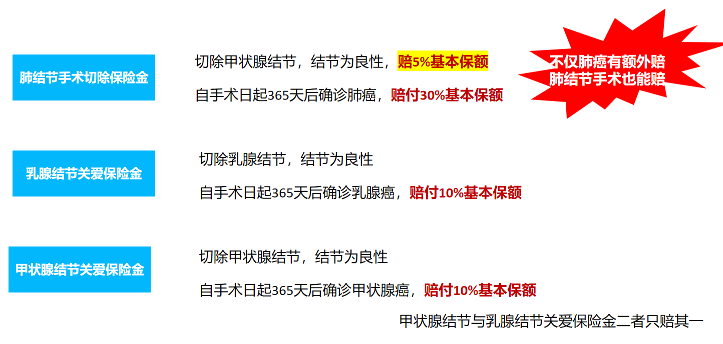 结节关爱金:切除肺/乳腺/甲状腺结节(非癌症),60岁前且手术满365天后确诊该器官重度恶性肿瘤,额外赔15%保额。