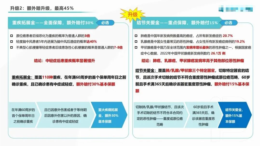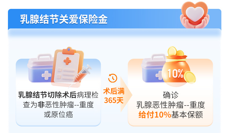 甲状腺、乳腺结节手术(非恶性/原位癌)后,1年确诊对应癌症也能多赔10%。