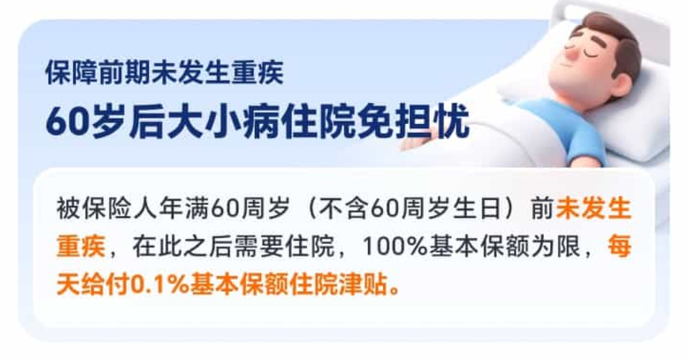 60岁前没确诊重疾,60岁后不管是感冒住院还是意外住院,每天能拿0.1%基本保额(比如50万保额每天500元),每年最多90天,一辈子累计能拿满100%保额,相当于给晚年医疗加了层缓冲。
