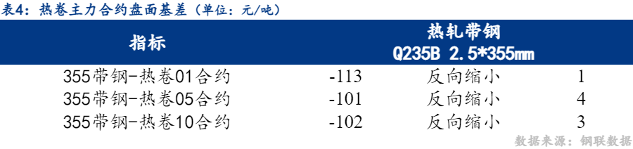 27日市场热卷01合约与唐山355带钢价差反向缩小1元/吨,热卷05合约与唐山355带钢价差反向缩小4元/吨。