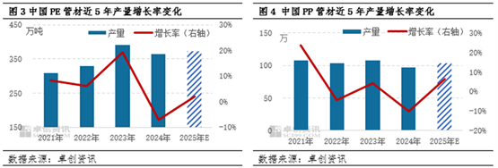 就与聚烯烃管材相关的地产及基建行业来看,未来五年房地产市场将以追求“高质量发展”为主要目标,投资规模方面也将从过去的追求总量高增,转入逐步放缓进入稳定增长的格局,所以对房地产投资增长的预期增速水平也将有所调降。尽管房地产投资增速调降,但新建住宅仍有一定规模,且存量房改造升级与城市更新项目将成为新的增长点,这将为PP管道行业提供持续的市场空间。预计未来五年,PP管道在房地产领域的需求总量将保持基本稳定,但增速可能会因房地产投资规模增速放缓而有所下降。另一方面房地产领域中绿色建筑标准提升,或将面临产品结构调整,对高端产品需求增加,推动上游供应端生产的优化升级,促使PPR、地暖二型管材等高端环保型聚烯烃管材需求增加。