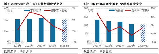 2021-2025年,聚烯烃管材需求在终端市政基建及房地产行业景气度偏弱下,需求增速均有不同程度的放缓。2022年以来受基建项目施工放缓影响,PE管材需求总量增速放缓,尤其2024年需求开始回落,地产及基建等终端恢复不佳下,实际需求跟进缓慢,企业生产积极性下降,下游管道行业处于淘汰出清阶段,行业利润压缩严重,需求处于下行阶段。近五年的PE管材消费量复合增长率在-0.88%,2025年的消费量在403万吨,同比去年降低3.13%;而PP管材作为建筑水电系统的核心材料,80%以上的需求集中于住宅、商业地产等建筑内冷热水管道,与房地产开发投资、新开工面积及存量改造需求存在较强的联动性。2021-2025年,中国房地产需求经历了从“高速增长”到“深度调整”再到“存量主导”的结构性转变,房地产新开工面积持续收缩下导致PP管材企业订单承压,需求端难以得到有效恢复。在房地产需求走弱拖累下,近年来需求呈现走弱趋势,近五年的PP管材消费量复合增长率在-2.28%,预计2025年的消费量在104.1万吨,同比去年降低2.71%。