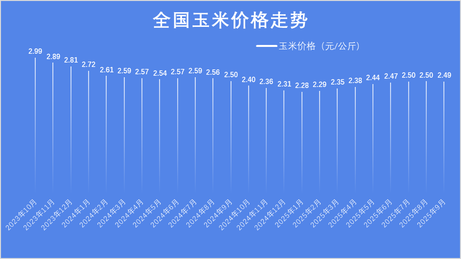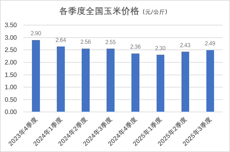 农业农村部监测数据显示,2025年第三季度玉米平均价格为2.49元/公斤,比去年同期下降2.2%,环比上升2.7%。其中,7月份全国玉米平均价格为2.50元/公斤,8月份 2.50元/公斤,9月份2.49元/公斤,7—9月份总体呈平稳态势。今年第三季度,主产区黑龙江、吉林、辽宁三省玉米平均价格为2.30元/公斤,其中,7月份平均价格2.28元/公斤,8月份2.31元/公斤,9月份2.32元/公斤。主销区广东省价格为2.57元/公斤,其中,7月份平均价格2.59元/公斤,8月份2.59元/公斤,9月份2.54元/公斤。三季度主产区和主销区玉米价格环比增加、同比下降。