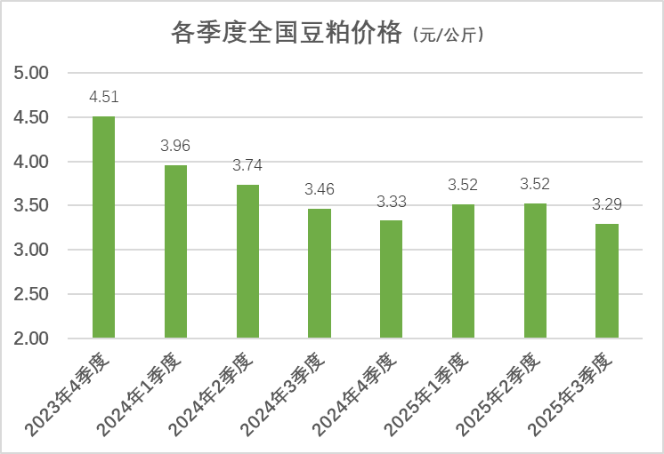 第三季度豆粕平均价格为3.29元/公斤,其中,7月份全国豆粕平均价格为3.29元/公斤,8月份3.30元/公斤,9月份3.30元/公斤。7—9月份豆粕价格比2025年第二季度下降6.5%,和去年同期下降4.9%。