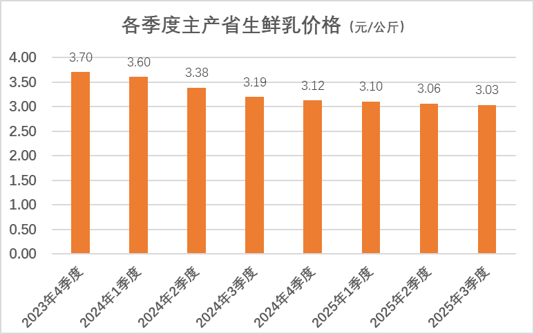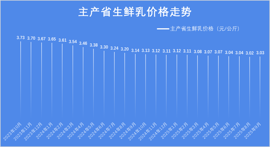 根据农业农村部对全国500个县集贸市场定点监测,2025年7—9月份, 河北、山西、内蒙古、辽宁、黑龙江、山东、河南、陕西、宁夏、新疆等10个主产省生鲜乳平均价格维持在每公斤3.03元左右。7月份、8月份、9月份主产省生鲜乳平均价格分别为3.04元/公斤、3.02元/公斤、3.03元/公斤。总的看,第三季度10个主产省生鲜乳平均价格呈下降趋势,同比下降5.1%,环比下降1.0%。