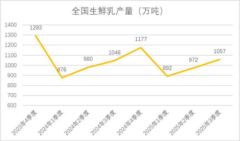 2025年第三季度,全国牛奶产量1057万吨,比去年同期增长11万吨,增长1.1%。