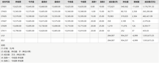 棉花期货6个合约,各合约涨跌不一,品种持仓量954257手,较上一交易日减少6999手。