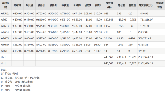 当日苹果期货各合约全部上涨,成交量245562手,品种持仓量238411手,较上一交易日增量26220手。