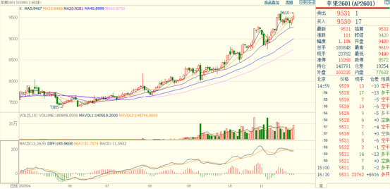 当日(20251126),期货品种苹果AP2601合约高位震荡,当日收至9531点,较昨日上涨1.18%,全日成交180848手,持仓143791手,较上一交易日增加19254手。