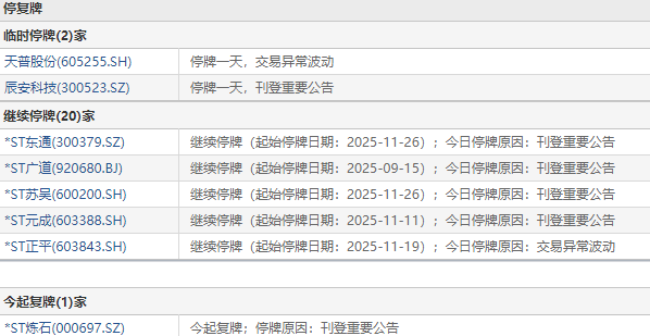 上证报中国证券网讯 11月28日,2家公司临停:天普股份、辰安科技,1家公司复牌:*ST炼石。