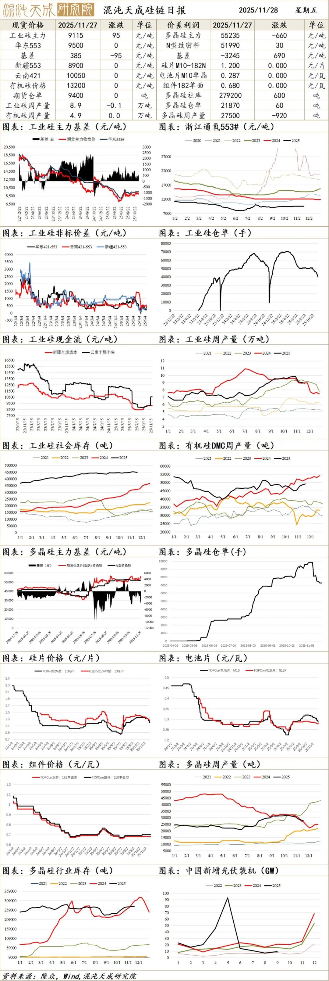 1、反内卷实际影响不大,核心供需边际改善,但仍累库。11月供需双弱,西南兑现减产,合盛恢复至八成开工,据传暂不会继续提升。需求端有机硅行业反内卷已达成一致,有限产提价预期,多晶硅产量在小幅下降。