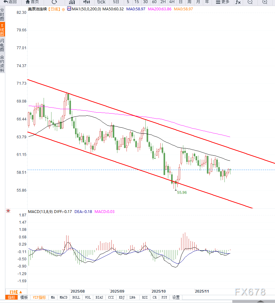 从日线走势来看,美原油维持再58.90美元附近,短期维持小幅震荡。价格连续多日收于主要短期均线下方,反映趋势偏弱结构已经形成。MACD动能柱在零轴下方进一步扩散,表明下行动能仍在累积;