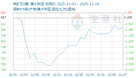 11月以来,铁矿行情先是大幅下跌,随后震荡上行,整体呈偏弱震荡走势,据生意社铁矿追踪价格显示,截至30日生意社铁矿价格指数为811,环比下跌0.79%,其中,在9日达到月内最低点为787.56,跌幅度达到3.22%,具体如上图。