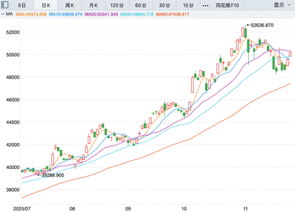 11月21日,日本内阁正式批准规模达21.3万亿日元(约合1354亿美元)的综合经济对策。计划公布后,日经225指数迅速跌破49000点关键支撑位,日元兑美元汇率在157区间持续承压(接近160的官方干预警戒线),10年期日本国债收益率更是一度飙升至1.779%的高位。