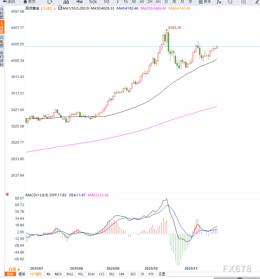整体来看,黄金技术结构偏多,但能否突破4200美元仍是决定后续趋势方向的核心关键。
