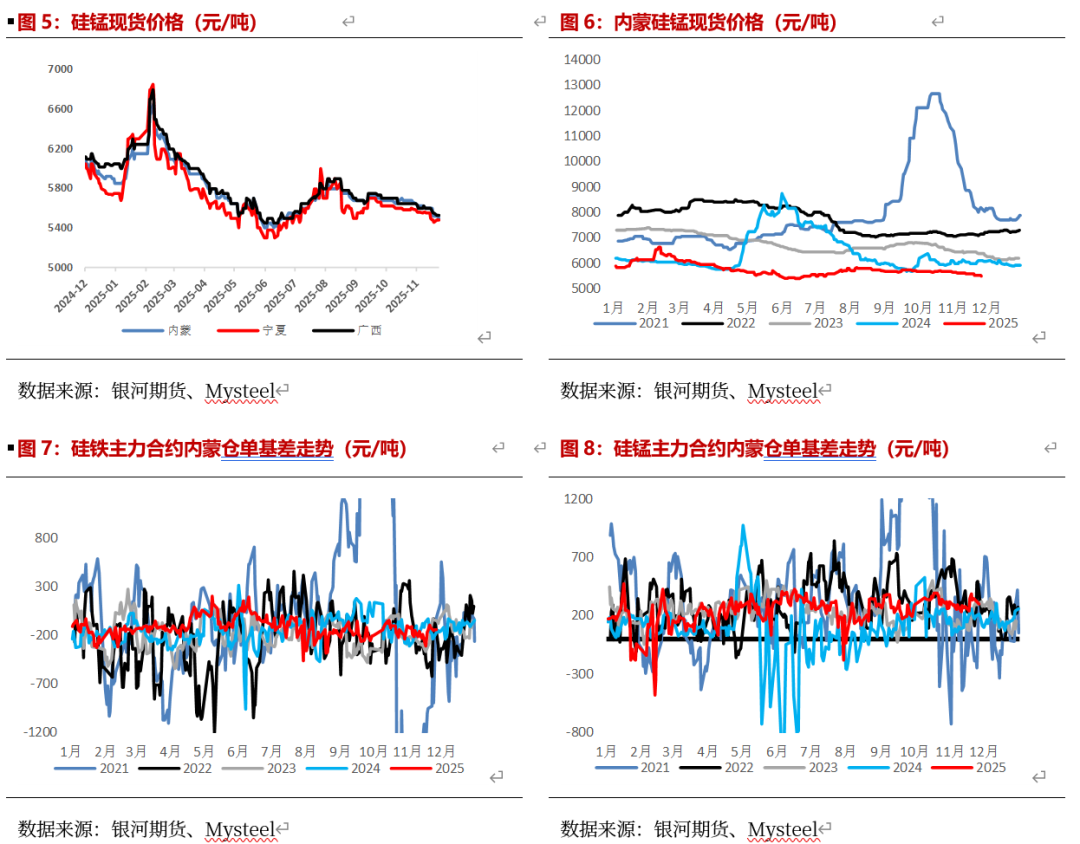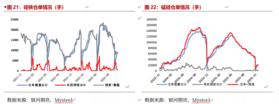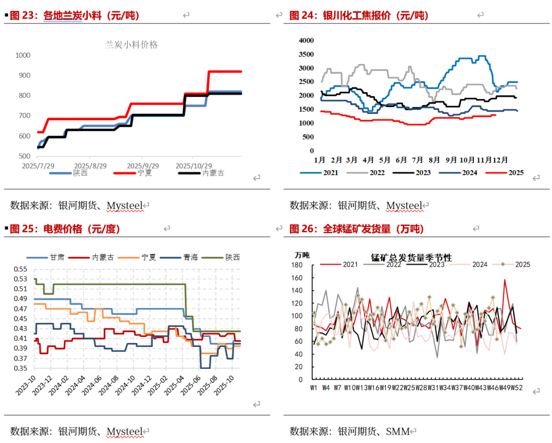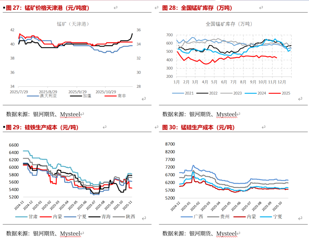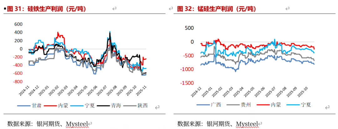 硅铁方面,随着价格来到低位,供应端开启减产趋势,样本企业产量持续小幅下降。需求端,近期钢材库存去化表现尚可,钢材利润有所修复,预计带动短期钢材产量有所反弹。但从钢厂高炉检修计划推算,这种复产趋势预计难以持续,预计12月铁水产量仍将震荡下行。成本方面,11月电价稳中偏强,成本端有所抬升。总体来看,在供需双弱和成本支撑共同作用下,价格底部震荡为主。