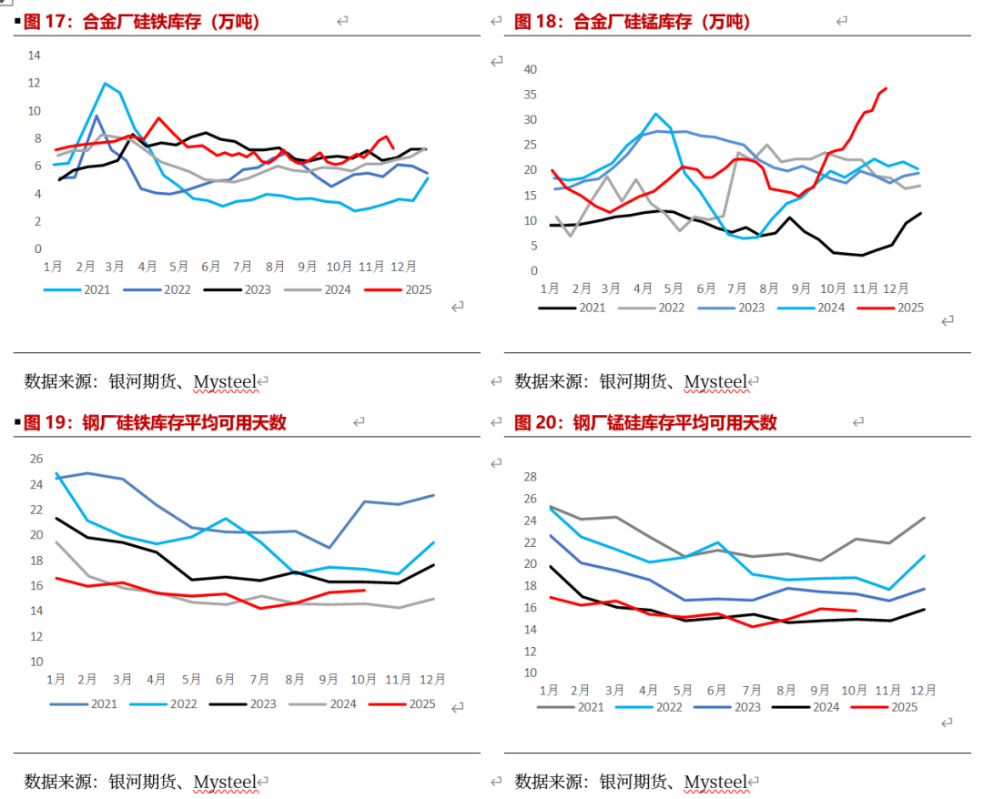 11月,铁合金期货价格震荡下行。分析原因主要如下:11月钢材利润整体承压,钢厂检修陆续增多,对原料需求产生冲击。在需求走弱压力下,硅铁和锰硅的企业库存均处于历史同期高位,特别是锰硅库存攀升趋势明显,对价格形成压力。