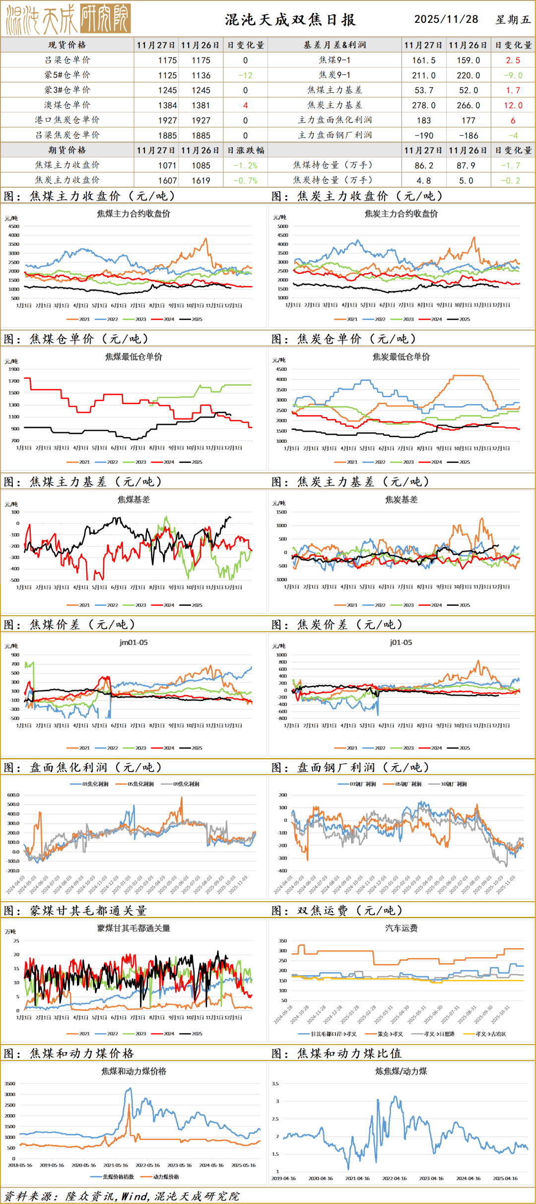 2.中国煤炭资源网冶金部11月27日重点关注:焦炭市场持稳运行,随着炼焦煤价格持续回落,焦化盈利能力改善,外加供应端暂无环保等外力扰动,供应端生产积极性较高,焦化延续分化累库表现,下游钢厂整体到货改善,部分钢厂基于高炉检修多开始有一定控量行为,整体看焦炭基本面逐步趋向弱平衡,短期看随着原料成本坍塌以及需求转弱预期较强背景下,焦炭降价落地预期较强。焦煤方面,山西吕梁地区部分煤矿因同集团矿点发生事故集体停产,涉及产能510万吨,区域内供应有所收窄,目前产地供应扰动频繁,供应端延续偏紧格局。下游集体观望,原料端成交氛围低迷,煤矿线上竞拍流拍率居高不下,产地坑口报价降价范围及降幅也在逐渐扩大,且多数矿点降后成交仍未有明显改善,整体看煤价短期依然承压。进口蒙煤方面,昨日中蒙口岸因蒙古共和国成立日闭关一天,今日恢复正常通行,目前市场情绪偏弱,下游多观望为主,口岸成交较为清淡,蒙5原煤价格弱稳于1000元/吨左右。