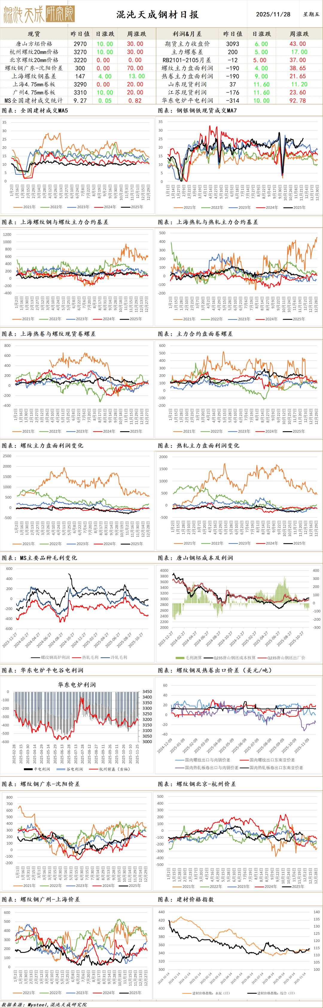 需求端,本周两机构数据均显示钢材厂库、社库延续下降,但降幅有所趋缓,且钢材表需多有回落。另据百年建筑调研,本周全国水泥出库量296.5万吨,环比上升2%,基建水泥直供量环比上升1.8%;混凝土发运量为154.05万方,环比微增0.06%;样本建筑工地资金到位率59.56%,周环比下降0.24个百分点,显示建筑下游需求依然喜忧参半。海外方面,随着美联储重要官员鸽派发言,叠加中美领导人再度通话,近期外盘商品多有上涨。国内方面,本周央行开展10000亿元MLF操作,六部门印发促销费方案,发改委召开价格无序竞争成本认定工作座谈会,国内宏观政策预期依然向好。进出口方面,昨日东南亚钢价微降,国外其它地区钢价依然持稳,近期国内外冷热卷价差有部分收窄,国内钢材出口空间趋减。