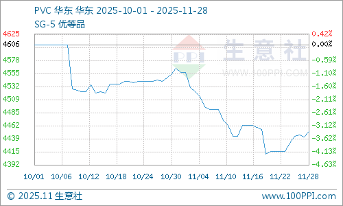 据生意社商品行情分析系统监测显示,本周(11.24-28)PVC现货市场区间调整为主,价格较之上周变动不大,周内市场价格微幅上涨,涨幅在0.48%。截止周五,国内PVC电石法SG-5型均价4452元/吨。