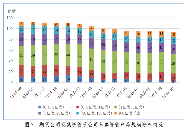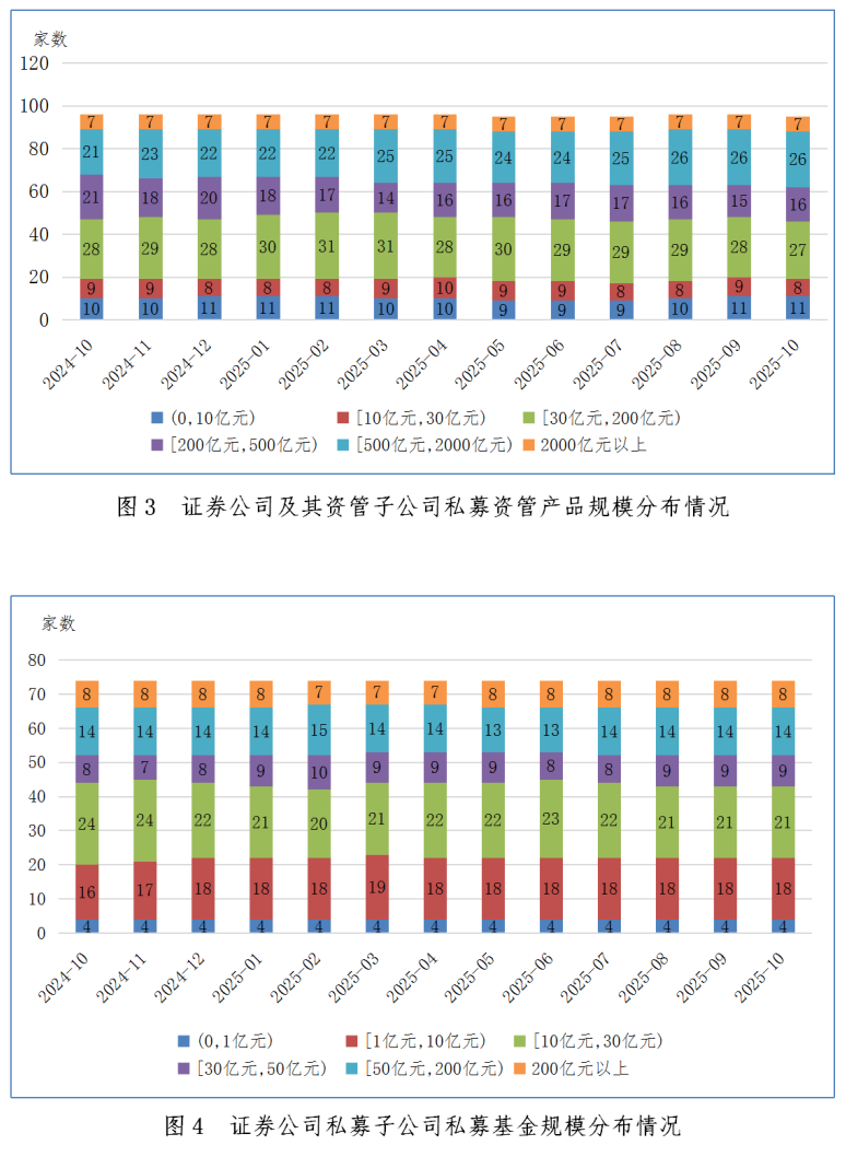 截至2025年10月底,证券公司及其资管子公司平均管理私募资管产品规模609.58亿元,管理规模中位数228.55亿元;证券公司私募子公司平均管理私募基金86.30亿元,管理规模中位数为20.34亿元;基金管理公司平均管理私募资管产品规模358.00亿元,管理规模中位数105.10亿元;基金子公司平均管理私募资管产品规模163.63亿元,管理规模中位数32.17亿元;期货公司及其资管子公司平均管理私募资管产品规模40.94亿元,管理规模中位数3.69亿元。(证券期货经营机构管理私募资管产品规模分布情况见图3至7)