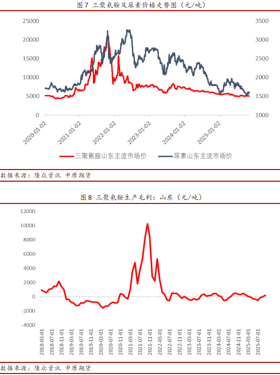 2025年以来,受新增产能陆续释放以及需求表现疲软影响,国内三聚氰胺价格整体呈现震荡承压运行。以山东主流市场价为例,截至2025年11月26日山东主流市场价为5190元/吨,较年初降幅达360元/吨,最高价在4月初的5800元/吨,最低价则是7月份的4990元/吨,年内最大涨跌幅达810元/吨。行业成本及利润方面,截至2025年10月31日,山东地区三聚氰胺生产成本为4857元/吨,生产毛利为219元/吨,三聚氰胺市场价格持续围绕成本附近波动,行业利润空间则以低位窄幅变动为主。