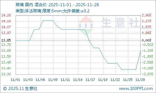 需求方面:据生意社商品分析系统显示,本周玻璃行情先跌后涨,截止11月28日市场均价在13.68元/平方米,与11月21日价格13.48元/吨相比涨幅1.48%。本周玻璃市场开工率小幅减少,下游采买积极性增加,企业出货较好,玻璃社会库存减少,玻璃价格行情窄幅上涨。