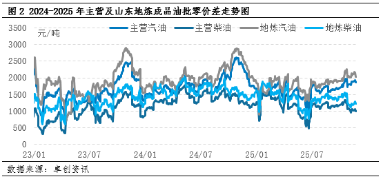 据卓创资讯数据统计,截至11月27日,国内加油站销售地炼柴油平均理论利润为1223元/吨,折算升价为1.04元,较中旬上涨2.24%;销售主营柴油理论利润为1003元/吨,折算升价为0.85元,较中旬下跌4.53%。汽油方面,销售地炼汽油理论利润为2026元/吨,折算升价为1.50元/升,较中旬下跌3.91%;销售主营汽油理论利润为1863元/吨,折算升价为1.38元/升,较中旬下跌0.90%。虽然批零价差收窄,但目前汽油需求仍处淡季,加油站销量受到较大影响,因此目前民营加油站汽油优惠幅度仍在0.5-1.5元/升。