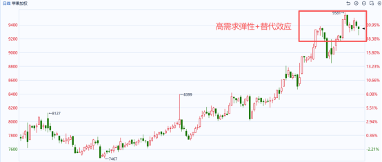 以国内苹果期货为例,2025年新季苹果优果率下降,符合交割标准的货源稀缺,价格从8000元/吨涨至9500元/吨,但随着价格高企,大众消费转向柑橘、梨,需求增速有所回落。一般地,高需求弹性下,价格与需求替代相互作用,波动幅度大且节奏多变。