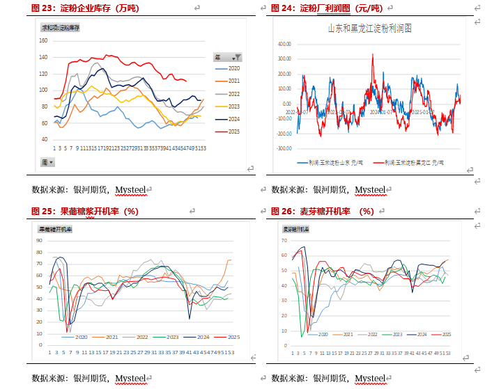 2025年11月玉米现货开始上涨,副产品价格相对稳定,淀粉也在上涨,淀粉企业盈利较好。淀粉企业开机率上升,下游有备货需求,淀粉库存回落。截止11月19日,96家深加工玉米库存272.7万吨,低于上月同期的282.7万吨,低于去年同期的384.2万吨。黑龙江玉米库存102.7万吨,低于去年的3.63%,山东玉米库存44.2万吨,低于去年54.2%。淀粉企业开机率持续回升,截止11月26日,淀粉企业开机率为61.38%。淀粉库存高于去年,淀粉企业利润增加。截止11月26日,黑龙江淀粉利润为68元/吨,山东利润8元/吨。截止11月26日,淀粉库存为106.9万吨,月降幅5.2%,年同比增幅19.04%。由于淀粉行业利润较好,但下游需求仍偏弱,淀粉库存处于高位,预计12月随着新季玉米供应增加,且玉米现货仍有下跌空间,淀粉行业利润仍较好。