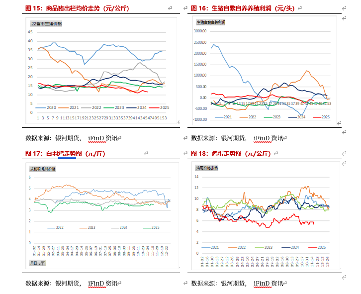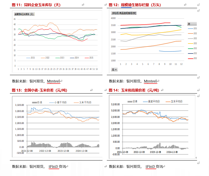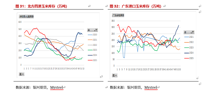 2025年11月吉林玉米集中上市,但由于华北粮质较差,下游饲料企业及贸易商陆续建库存,导致玉米下跌幅度较小,且北港库存较低,下游执行合同较多,同时农户存在惜售,11月下旬铁路运输暂停,导致北港玉米现货上涨幅度较大,盘面玉米大幅反弹。11月市场交易点主要是:农户惜售及下游存在刚需补库,导致东北玉米下跌幅度低于预期,港口库存较低,贸易商开始囤货,玉米现货出现反季节上涨。对于淀粉由于玉米原料的上涨,同时泰国水灾导致木薯淀粉价格上涨,部分造纸行业改用玉米淀粉,玉米淀粉库存开始下降,玉米淀粉也在上涨。预计12月东北及华北玉米仍有一波卖压,且价格上涨后,贸易商囤货意愿较弱,在下游需求仍未改善情况下,预计玉米现货仍有下跌空间,玉米淀粉也会下跌。但考虑到12月底部分企业存在备货,预计玉米现货与期货下跌空间有限。