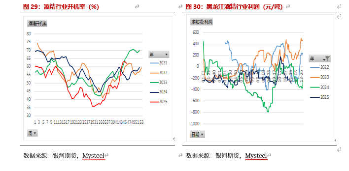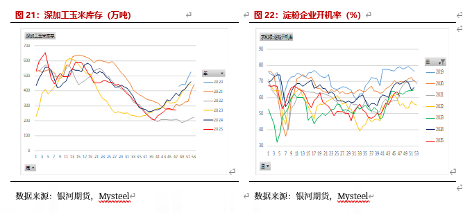 酒精行业,11月由于玉米现货上涨,酒精利润亏损,行业开机率仍偏高。11月由于玉米价格继续上涨,酒精利润亏损扩大。截止11月25日,黑龙江利润为-293元/吨,河南酒精利润为-471元/吨。由于华北玉米霉变率较高,预计酒精用玉米供应宽松,玉米现货仍有回落空间,开机率会继续回升,酒精利润有所好转。预计12月酒精行业开机率仍会继续上升,酒精行业对玉米消耗量也会继续增加。